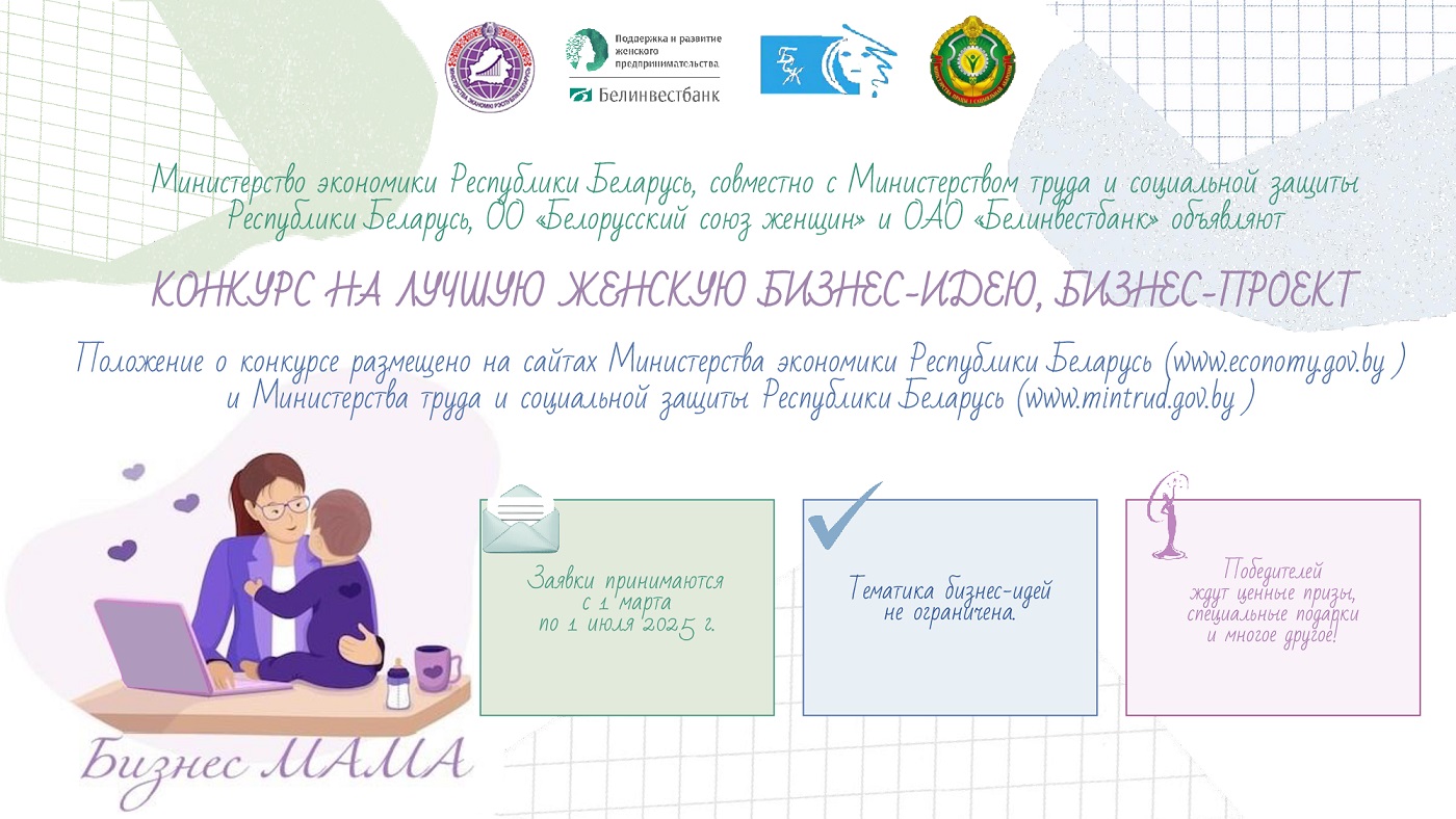 Конкурс проводится при поддержке Министерства труда и социальной защиты Республики Беларусь. Цель конкурса – стимулирование развития предпринимательской инициативы женщин-матерей.